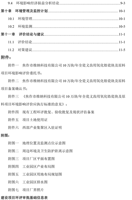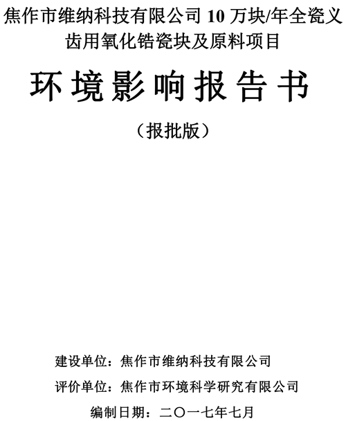 關于焦作市維納科技有限公司10萬塊/年全瓷義齒用氧化鋯瓷塊及原料項目環評報告書信息公司。