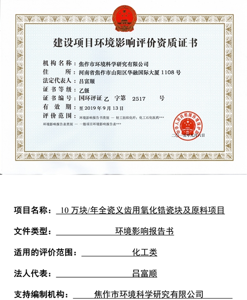 我公司10萬塊/年全瓷義齒用氧化鋯瓷塊及原料項目已由焦作市環境科學研究有限公司編制完成,現對報告書(報批版),予以全文信息公開。